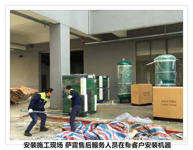 薩震空壓機的服務(wù)工程師們?yōu)樵摴具M行機器安裝和開機調(diào)試。