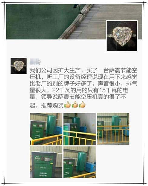 感謝該用戶對(duì)薩震節(jié)能空壓機(jī)的信任與支持,這也將是我們進(jìn)步的最大動(dòng)力!