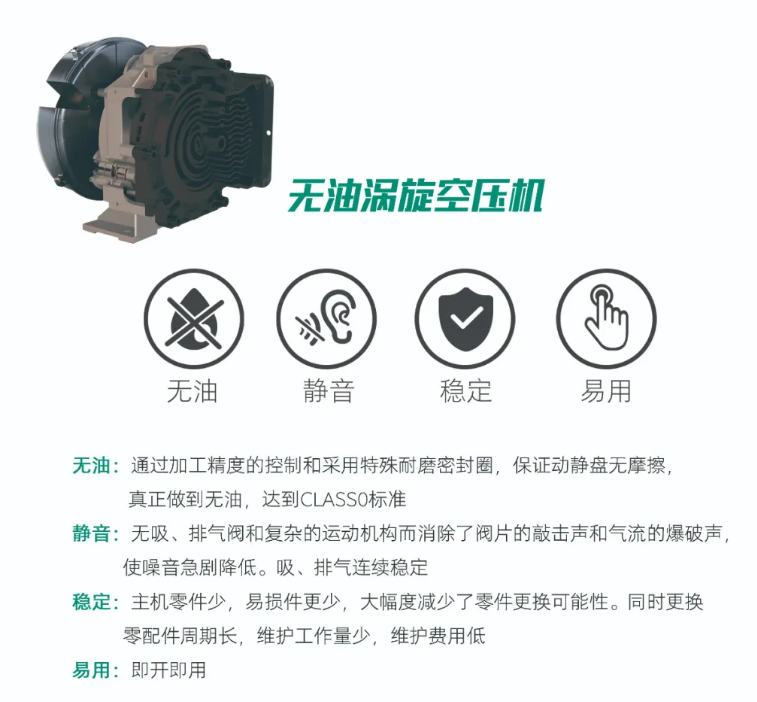 渦旋機主要是用在醫(yī)院、制藥、食品、飲料、酒廠、實驗室等一些對噪音和振動要求較高的場所,這跟渦旋機靜音、壓縮空氣無油特性有直接關系。