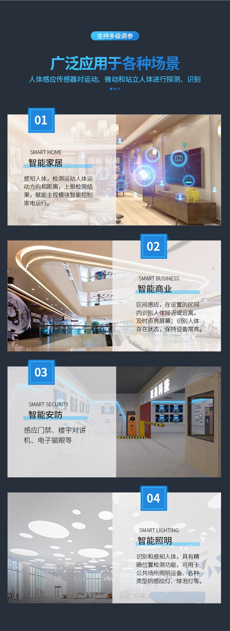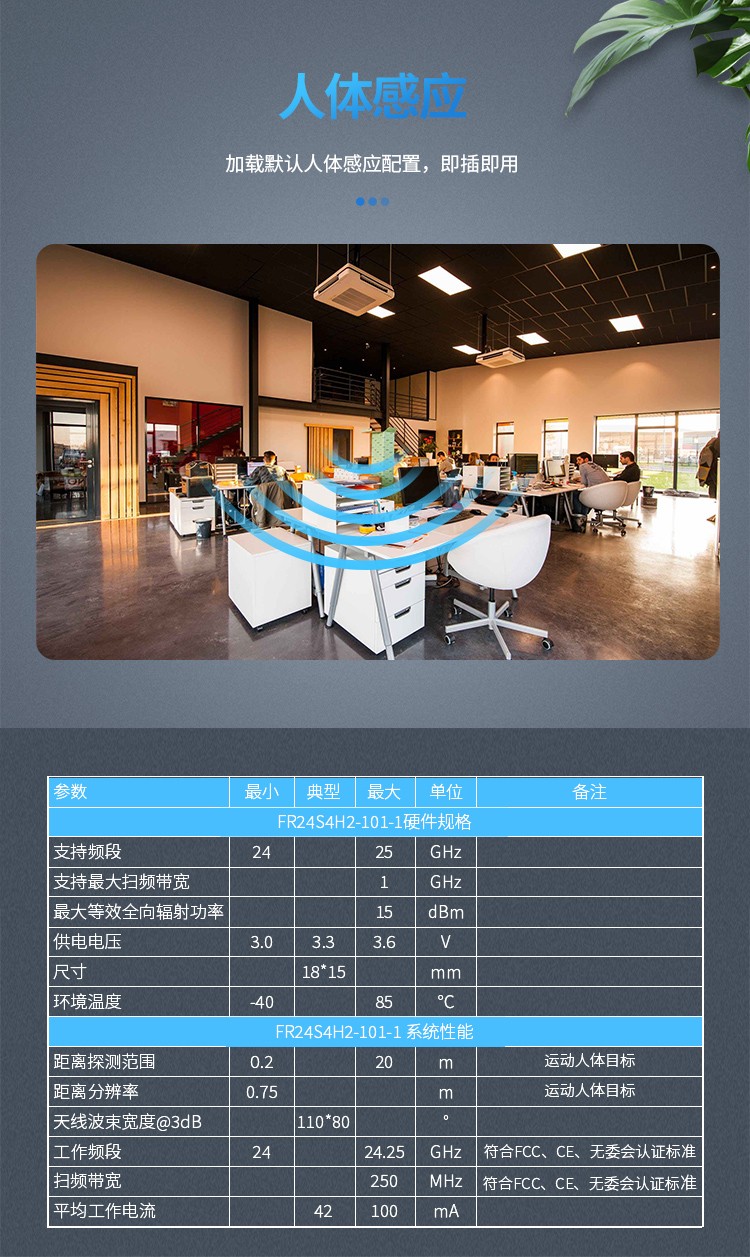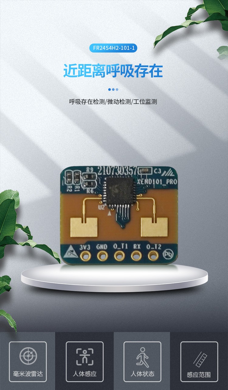 FR24S4H2-101-1 是飛睿智能設計的人體感應傳感器,包含極簡化 24G 雷達傳感器硬件和智能算法固件。硬件搭載高性能 24GHz 一發(fā)一收天線和外圍電路;人體感應算法,采用毫米波雷達距離測量技術和高性能芯片先進的專有信號處理技術,實現(xiàn)對運動、微動和站立人體的精確感知。固件主要應用在室內場景,感知區(qū)域內是否有運動或者微動的人體,實時刷新檢測結果。對運動人體的最遠感應距離為 20 米,可輕松配置感應距離范圍、不同區(qū)間的感應靈敏度及刷新時間,支持 GPIO 和 UART 接口,即插即用,靈活應用于不同的智能場景和終端產(chǎn)品。
