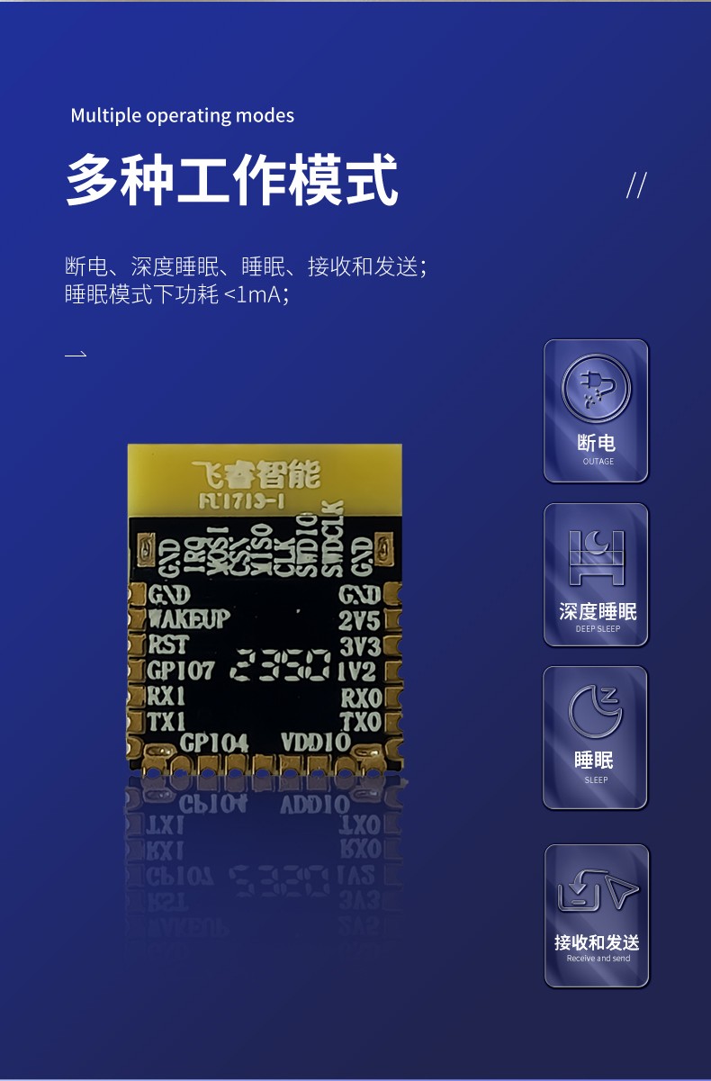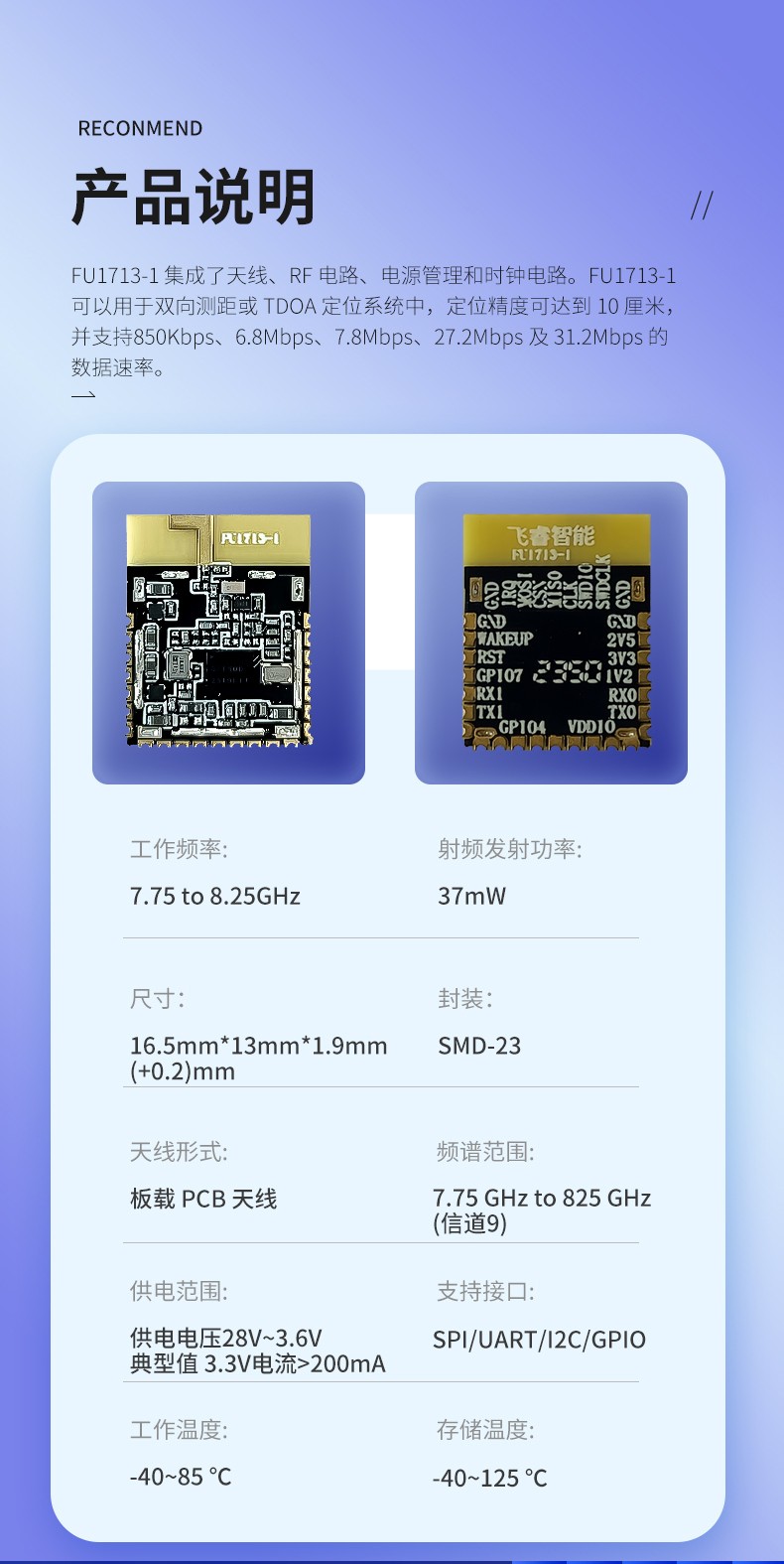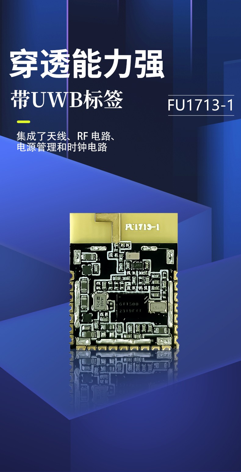 FU1713-1 集成了天線、RF 電路、電源管理和時鐘電路。FU1713-1 可以用于雙向測距或 TDOA 定位系統(tǒng)中,定位精度可達到 10 厘米,并支持850Kbps、6.8Mbps、7.8Mbps、27.2Mbps 及 31.2Mbps 的數(shù)據(jù)速率。