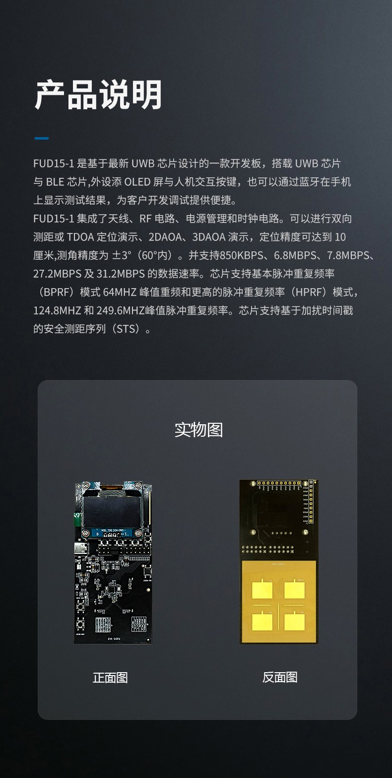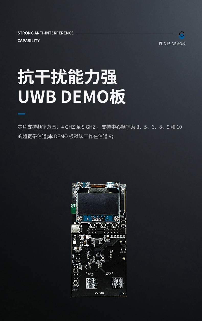 FUD15-1 是基于 UWB 芯片設(shè)計(jì)的一款開發(fā)板,搭載 UWB 芯片與 BLE 芯片,外設(shè)添 OLED 屏與人機(jī)交互按鍵,也可以通過藍(lán)牙在手機(jī)上顯示測試結(jié)果,為客戶開發(fā)調(diào)試提供便捷。 FUD15-1 集成了天線、RF 電路、電源管理和時(shí)鐘電路??梢赃M(jìn)行雙向測距或 TDOA 定位演示、2DAOA、3DAOA 演示,定位精度可達(dá)到 10 厘米,測角精度為 ±3°。