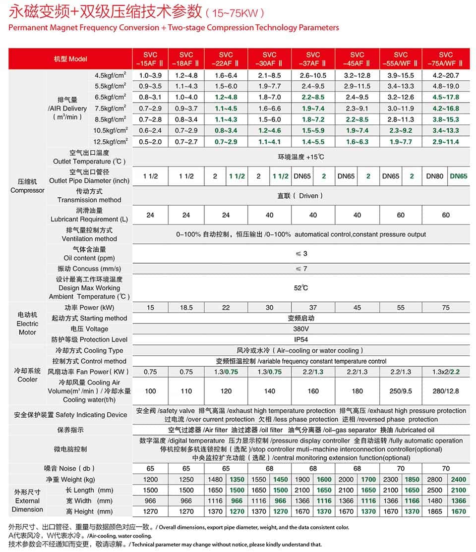 | 機型 | S-15AF Ⅱ | S-18AF Ⅱ | S-22AF Ⅱ | S-30AF Ⅱ | S-37AF Ⅱ | S-45AF Ⅱ | S-55AF Ⅱ | S-75AF Ⅱ | S-90AF Ⅱ | ||||||||||||||||||||||||||||||||